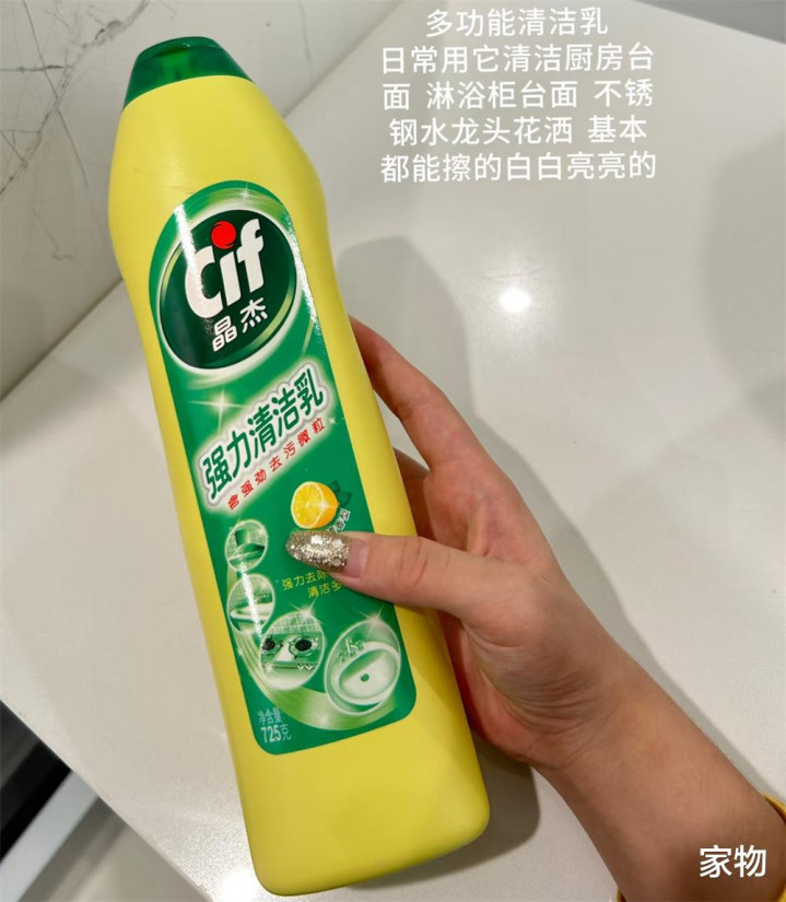 乳液质地的清洁用品,这东西是我最近比较爱用的,它不仅去油,还有亮白的效果,对于水龙头、花洒、马桶这类卫浴洁具,以及厨房的水槽、灶台都有不错的清洁效果。